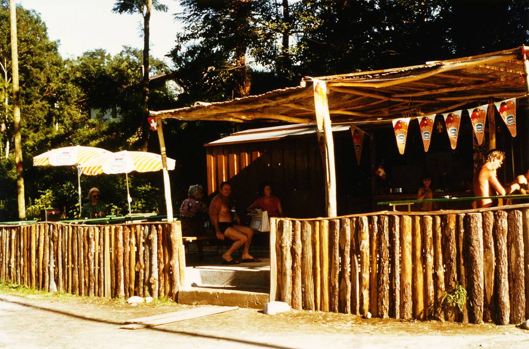 Ma anche questa buvette dell’estate 1979 non fu molto fortunata perché bruciò e se ne dovette costruire ancora un’altra con mezzi di fortuna: legno sì, ma per evitare il fuoco si pensò di usare una casetta in metallo di cantiere. Ecco come si presentava la buvette nell’estate 1981: